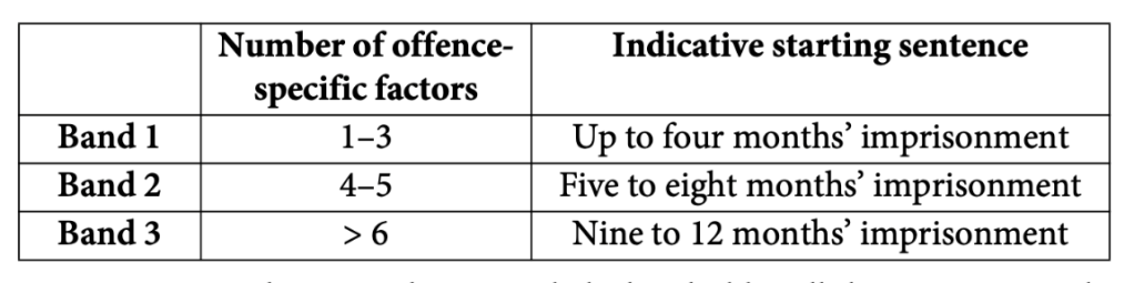The next step is to place the offence within the appropriate sentencing band to arrive at an indicative sentence. The table below sets out the appropriate sentencing bands for offences of the kind that arose in this appeal.